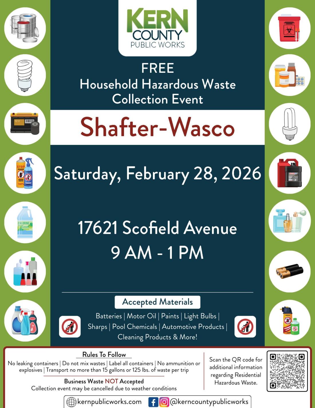 Shafter- Wasco resident: Kern County is hosting a FREE HHW collection event at 17621 Scofield Ave from 9 am to 1 pm. Some acceptable items are batteries, motor oil, paint, light bulbs, sharps, pool chemicals, automotive products, cleaning products, & more.