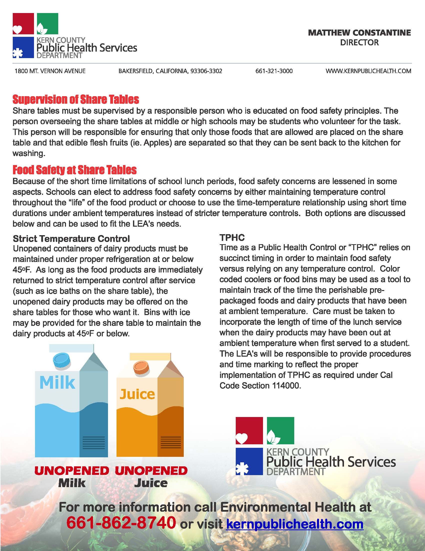 Kern County Public Health has come up with a letter with guidelines for school sites on what items can be placed on their share tables. The letter goes over What is a share table?, What foods are allowed on a share table?, Supervision of share tables, and Food Safety at share tables.