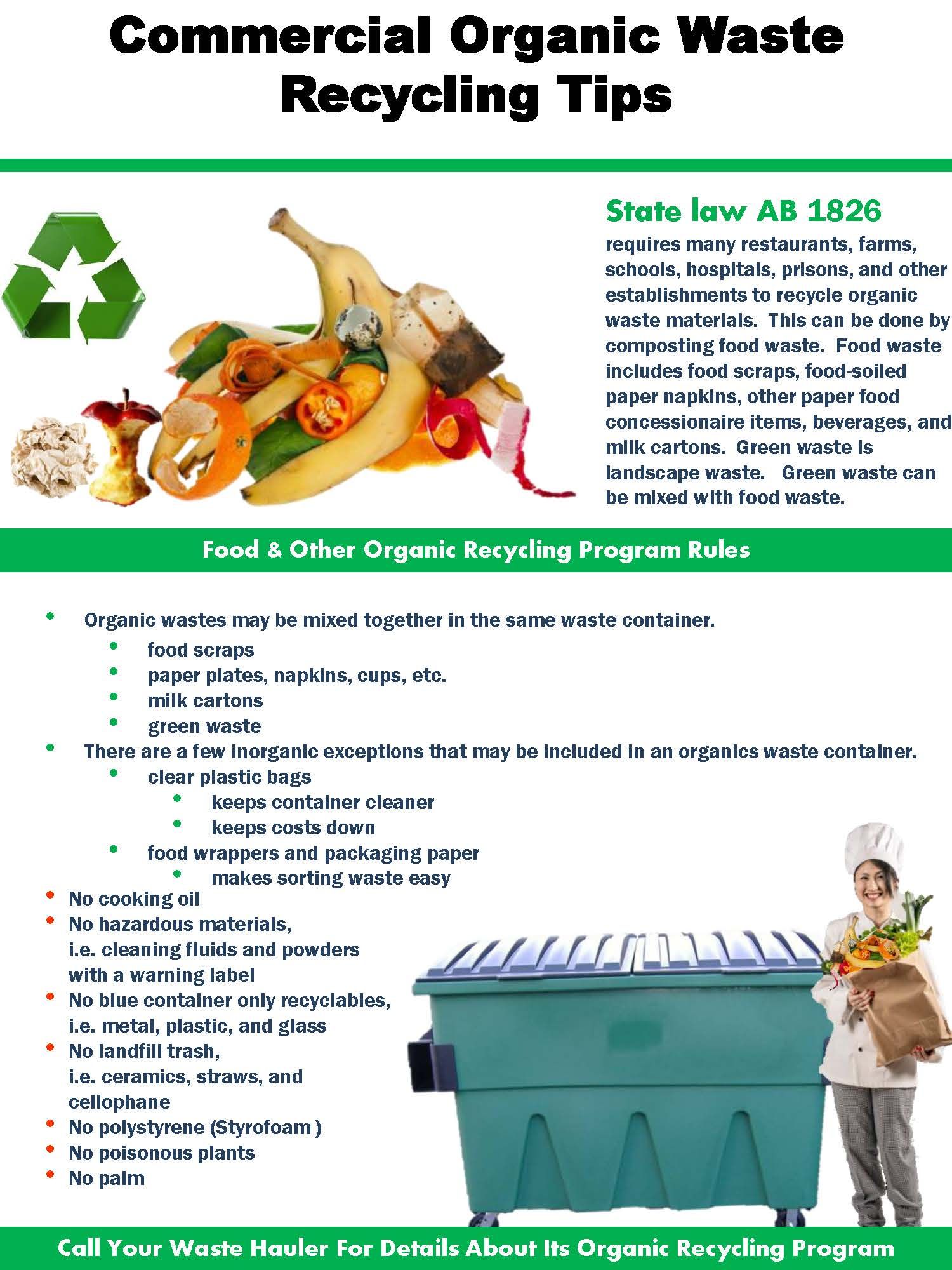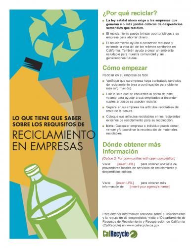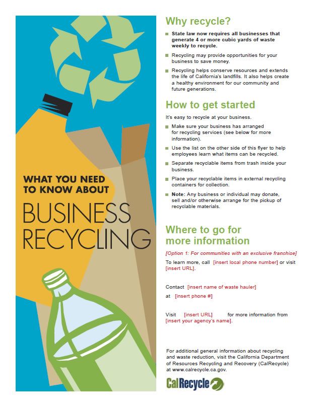 The sample commercial recycling flyer template can help local agencies educate businesses about new state requirements to recycle, and about any local requirements that may apply.