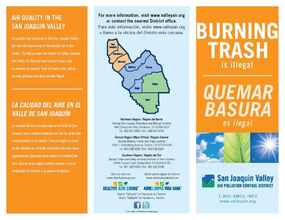 Burning trash is illegal. Air quality has improved in the San Joaquin Valley, but we still have some of the dirtiest air in the nation. To help protect the health of Valley families, the Valley Air District has created tough rules to improve air quality. One of these rules makes burning garbage and burn barrel illegal.
