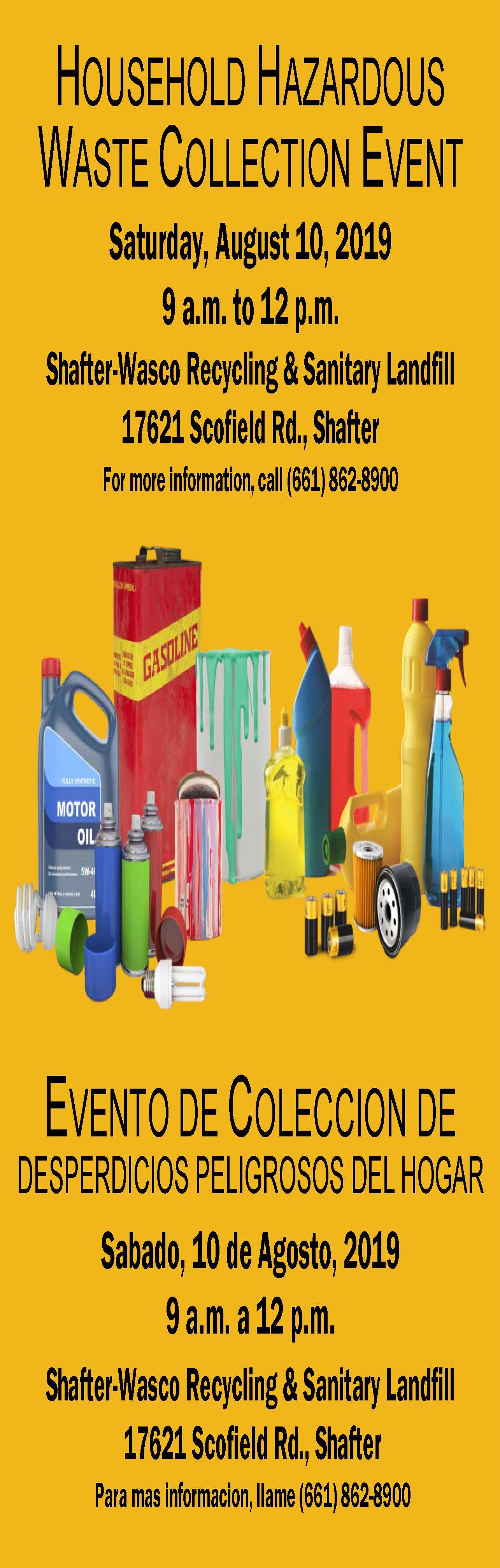 The Shafter- Wasco landfill is holding a free household hazardous waste collection event this Saturday. Event is being held from 9am - 12pm. Location is 17621 Scofield Rd. Shafter.